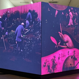 Medium- 7.5 x 7.5 x 6.6 ft LED cuboid. 4 part AI video with audio. Year 2023.